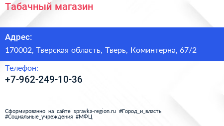 Табачный магазин по адресу 170002, Тверская область, Тверь, Коминтерна, 67/2 в дальнейшем Организация, размещена в следующих категориях: