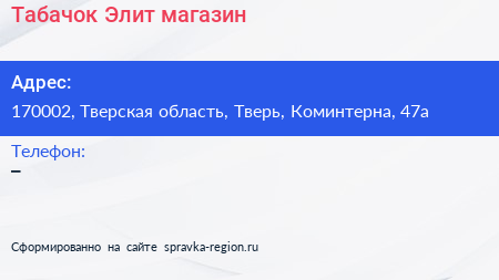 Табачок. Элит, магазин по адресу 170002, Тверская область, Тверь, Коминтерна, 47а в дальнейшем Организация, размещена в следующих категориях: