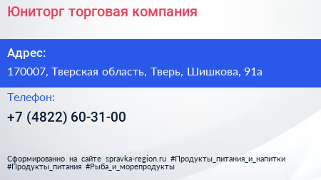 Юниторг, торговая компания по адресу 170007, Тверская область, Тверь, Шишкова, 91а в дальнейшем Организация, размещена в следующих категориях: