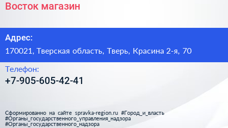 Восток, магазин по адресу 170021, Тверская область, Тверь, Красина 2-я, 70 в дальнейшем Организация, размещена в следующих категориях: