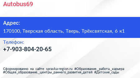 Autobus69 по адресу 170100, Тверская область, Тверь, Трёхсвятская, 6 к1 в дальнейшем Организация, размещена в следующих категориях: