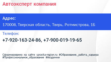 Автоэксперт, компания по адресу 170008, Тверская область, Тверь, Ротмистрова, 1Б в дальнейшем Организация, размещена в следующих категориях: