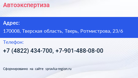Автоэкспертиза+ по адресу 170008, Тверская область, Тверь, Ротмистрова, 23/6 в дальнейшем Организация, размещена в следующих категориях: