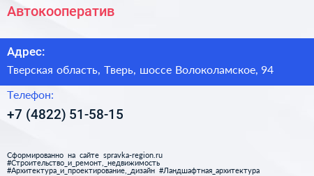 Автокооператив по адресу Тверская область, Тверь, шоссе Волоколамское, 94 в дальнейшем Организация, размещена в следующих категориях: