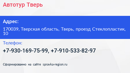 Автотур Тверь по адресу 170039, Тверская область, Тверь, проезд Стеклопластик, 10 в дальнейшем Организация, размещена в следующих категориях: