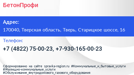 БетонПрофи по адресу 170040, Тверская область, Тверь, Старицкое шоссе, 16 в дальнейшем Организация, размещена в следующих категориях: