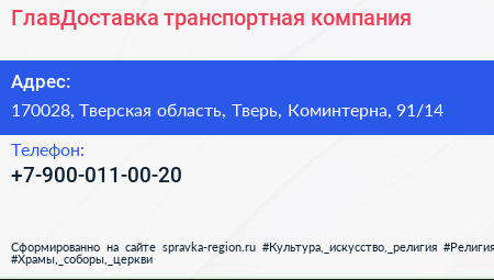 ГлавДоставка, транспортная компания по адресу 170028, Тверская область, Тверь, Коминтерна, 91/14 в дальнейшем Организация, размещена в следующих категориях: