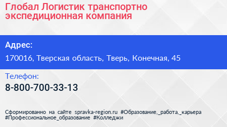 Глобал Логистик, транспортно-экспедиционная компания по адресу 170016, Тверская область, Тверь, Конечная, 45 в дальнейшем Организация, размещена в следующих категориях: