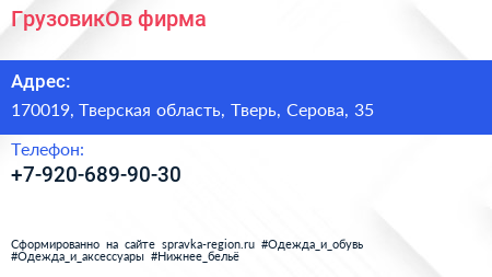 ГрузовикОв, фирма по адресу 170019, Тверская область, Тверь, Серова, 35 в дальнейшем Организация, размещена в следующих категориях: