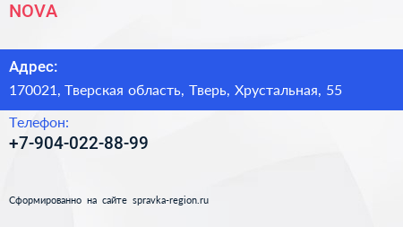 NOVA по адресу 170021, Тверская область, Тверь, Хрустальная, 55 в дальнейшем Организация, размещена в следующих категориях: