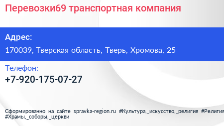 Перевозки69, транспортная компания по адресу 170039, Тверская область, Тверь, Хромова, 25 в дальнейшем Организация, размещена в следующих категориях: