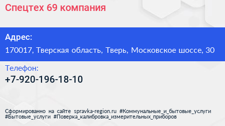 Спецтех 69, компания по адресу 170017, Тверская область, Тверь, Московское шоссе, 30 в дальнейшем Организация, размещена в следующих категориях: