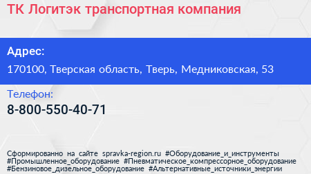 ТК Логитэк, транспортная компания по адресу 170100, Тверская область, Тверь, Медниковская, 53 в дальнейшем Организация, размещена в следующих категориях: