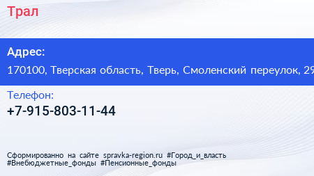Трал по адресу 170100, Тверская область, Тверь, Смоленский переулок, 29 в дальнейшем Организация, размещена в следующих категориях: