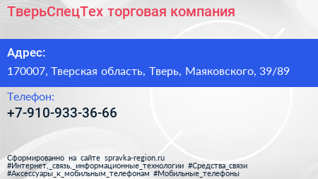 ТверьСпецТех, торговая компания по адресу 170007, Тверская область, Тверь, Маяковского, 39/89 в дальнейшем Организация, размещена в следующих категориях: