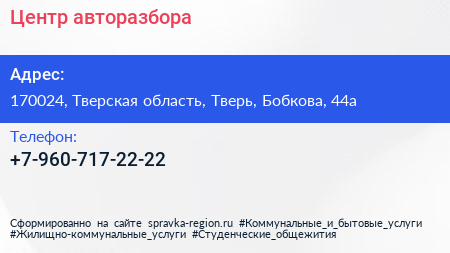 Центр авторазбора по адресу 170024, Тверская область, Тверь, Бобкова, 44а в дальнейшем Организация, размещена в следующих категориях: