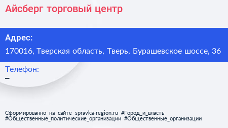 Айсберг, торговый центр по адресу 170016, Тверская область, Тверь, Бурашевское шоссе, 36 в дальнейшем Организация, размещена в следующих категориях: