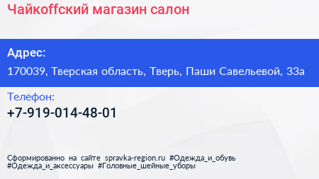 Чайкоffский, магазин-салон по адресу 170039, Тверская область, Тверь, Паши Савельевой, 33а в дальнейшем Организация, размещена в следующих категориях: