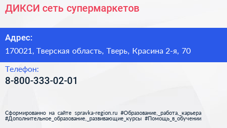 ДИКСИ, сеть супермаркетов по адресу 170021, Тверская область, Тверь, Красина 2-я, 70 в дальнейшем Организация, размещена в следующих категориях: