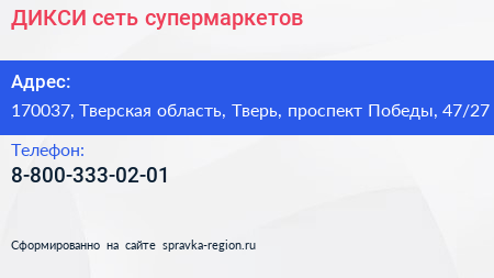 ДИКСИ, сеть супермаркетов по адресу 170037, Тверская область, Тверь, проспект Победы, 47/27 в дальнейшем Организация, размещена в следующих категориях: