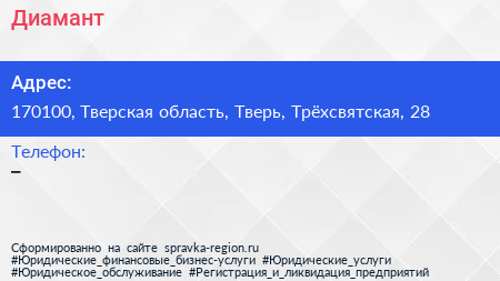 Диамант по адресу 170100, Тверская область, Тверь, Трёхсвятская, 28 в дальнейшем Организация, размещена в следующих категориях: