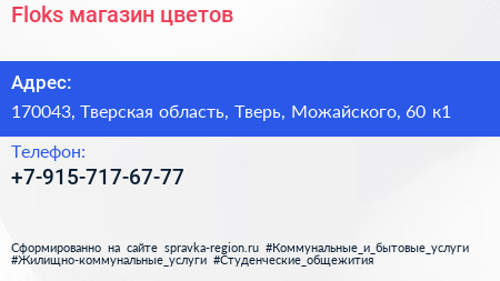 Floks, магазин цветов по адресу 170043, Тверская область, Тверь, Можайского, 60 к1 в дальнейшем Организация, размещена в следующих категориях: