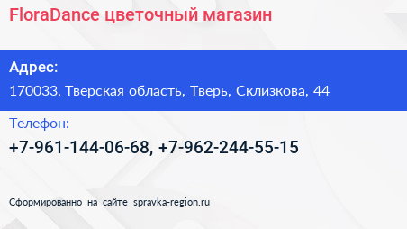 FloraDance, цветочный магазин по адресу 170033, Тверская область, Тверь, Склизкова, 44 в дальнейшем Организация, размещена в следующих категориях:
