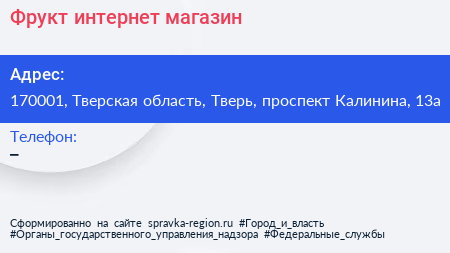 Фрукт, интернет-магазин по адресу 170001, Тверская область, Тверь, проспект Калинина, 13а в дальнейшем Организация, размещена в следующих категориях: