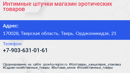 Интимные штучки, магазин эротических товаров по адресу 170028, Тверская область, Тверь, Орджоникидзе, 21 в дальнейшем Организация, размещена в следующих категориях: