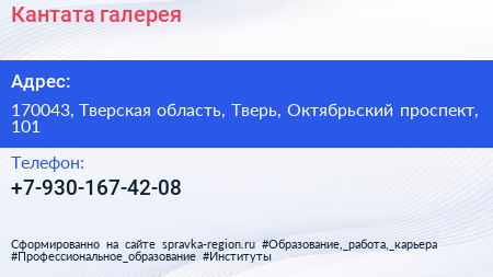 Кантата, галерея по адресу 170043, Тверская область, Тверь, Октябрьский проспект, 101 в дальнейшем Организация, размещена в следующих категориях:
