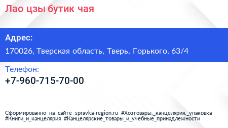 Лао цзы, бутик чая по адресу 170026, Тверская область, Тверь, Горького, 63/4 в дальнейшем Организация, размещена в следующих категориях: