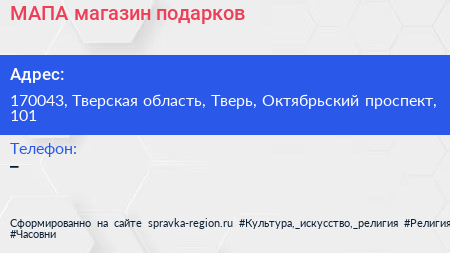 МАПА, магазин подарков по адресу 170043, Тверская область, Тверь, Октябрьский проспект, 101 в дальнейшем Организация, размещена в следующих категориях: