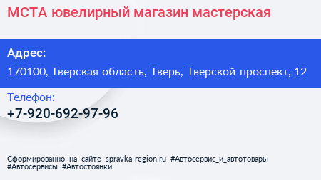 МСТА, ювелирный магазин-мастерская по адресу 170100, Тверская область, Тверь, Тверской проспект, 12 в дальнейшем Организация, размещена в следующих категориях: