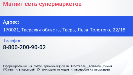 Магнит, сеть супермаркетов по адресу 170021, Тверская область, Тверь, Льва Толстого, 22/18 в дальнейшем Организация, размещена в следующих категориях: