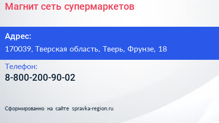 Магнит, сеть супермаркетов по адресу 170039, Тверская область, Тверь, Фрунзе, 18 в дальнейшем Организация, размещена в следующих категориях: