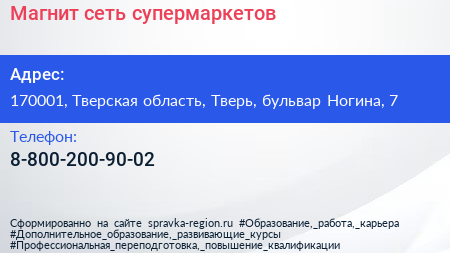 Магнит, сеть супермаркетов по адресу 170001, Тверская область, Тверь, бульвар Ногина, 7 в дальнейшем Организация, размещена в следующих категориях: