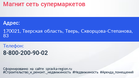 Магнит, сеть супермаркетов по адресу 170021, Тверская область, Тверь, Скворцова-Степанова, 83 в дальнейшем Организация, размещена в следующих категориях: