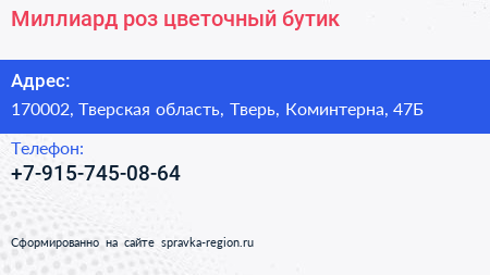 Миллиард роз, цветочный бутик по адресу 170002, Тверская область, Тверь, Коминтерна, 47Б в дальнейшем Организация, размещена в следующих категориях: