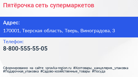 Пятёрочка, сеть супермаркетов по адресу 170001, Тверская область, Тверь, Виноградова, 3 в дальнейшем Организация, размещена в следующих категориях: