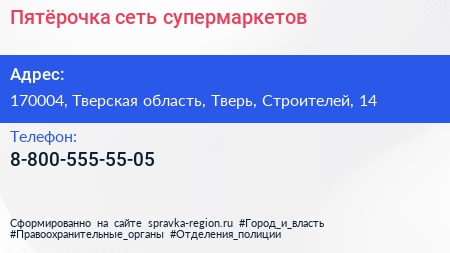 Пятёрочка, сеть супермаркетов по адресу 170004, Тверская область, Тверь, Строителей, 14 в дальнейшем Организация, размещена в следующих категориях: