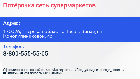 Пятёрочка, сеть супермаркетов по адресу 170026, Тверская область, Тверь, Зинаиды Коноплянниковой, 4а в дальнейшем Организация, размещена в следующих категориях: