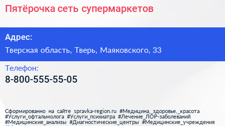 Пятёрочка, сеть супермаркетов по адресу Тверская область, Тверь, Маяковского, 33 в дальнейшем Организация, размещена в следующих категориях: