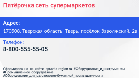 Пятёрочка, сеть супермаркетов по адресу 170508, Тверская область, Тверь, посёлок Заволжский, 2в в дальнейшем Организация, размещена в следующих категориях: