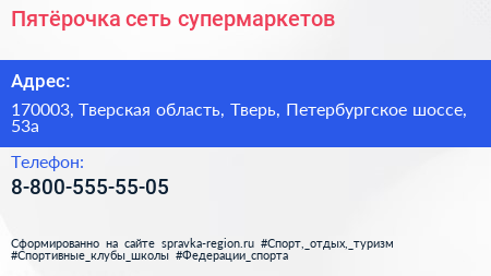 Пятёрочка, сеть супермаркетов по адресу 170003, Тверская область, Тверь, Петербургское шоссе, 53а в дальнейшем Организация, размещена в следующих категориях:
