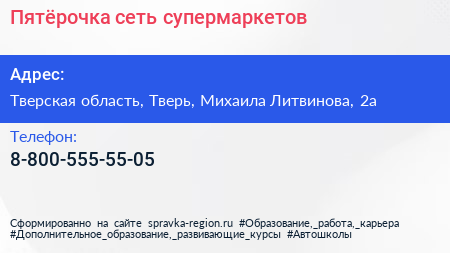 Пятёрочка, сеть супермаркетов по адресу Тверская область, Тверь, Михаила Литвинова, 2а в дальнейшем Организация, размещена в следующих категориях: