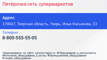 Пятёрочка, сеть супермаркетов по адресу 170027, Тверская область, Тверь, Ильи Касьянова, 13 в дальнейшем Организация, размещена в следующих категориях: