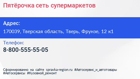 Пятёрочка, сеть супермаркетов по адресу 170039, Тверская область, Тверь, Фрунзе, 12 к1 в дальнейшем Организация, размещена в следующих категориях: