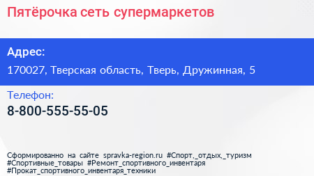 Пятёрочка, сеть супермаркетов по адресу 170027, Тверская область, Тверь, Дружинная, 5 в дальнейшем Организация, размещена в следующих категориях: