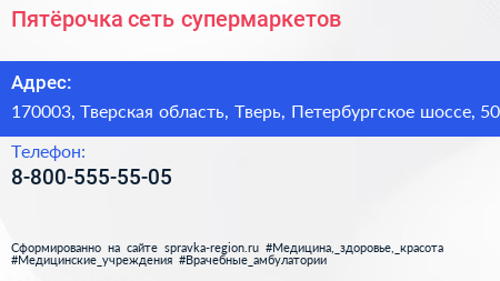 Пятёрочка, сеть супермаркетов по адресу 170003, Тверская область, Тверь, Петербургское шоссе, 50 в дальнейшем Организация, размещена в следующих категориях:
