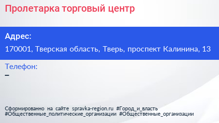 Пролетарка, торговый центр по адресу 170001, Тверская область, Тверь, проспект Калинина, 13 в дальнейшем Организация, размещена в следующих категориях: